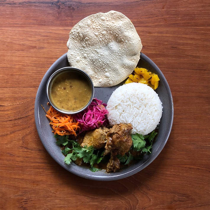 ランチのカレーは「チキンカレー」「キーマカレー」「魚貝カレー」など全部で3種。1種類から選べて、3種類全部入ったプレートもありました。今回は、定番なチキンカレーをチョイス!ワンプレートにおしゃれな盛り付けで、チキンが骨付きで入っていてとてもおいしそう♪