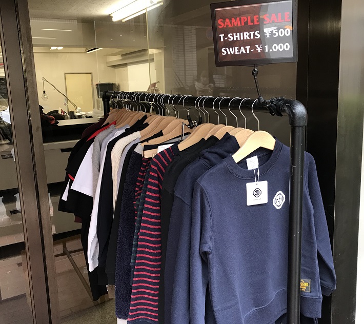 会社入り口に、「SAMPLE SALE(サンプルセール)」と書かれ、ハンガーに吊るされた洋服が売られているところもありました。