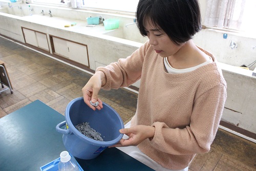 材料となるパルプをペットボトルに入れて、その中に水を入れます。