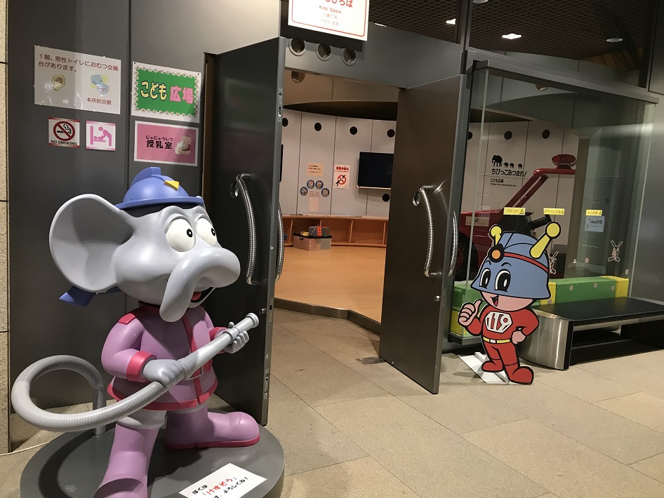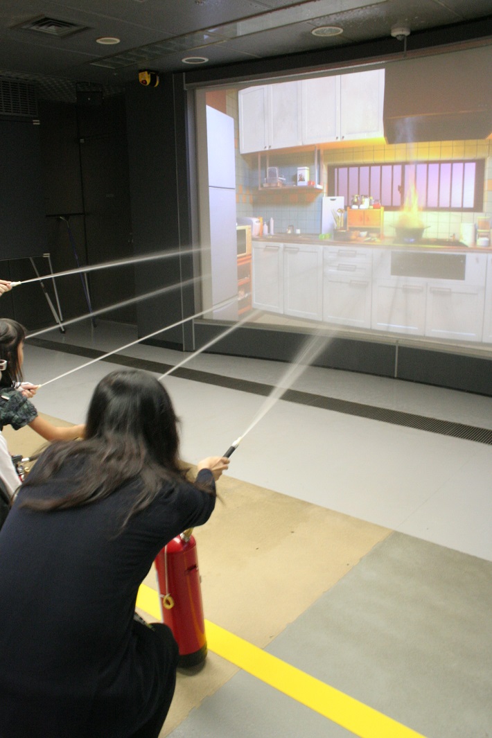 消火器体験のコーナーでは、前方スクリーンに映し出される火事の映像に向かって消火器から放水するのですが、最初に大声で「火事だーーーーーーー」と叫んで声量レベルが一定以上にならないと、映像がスタートしない仕組み。
