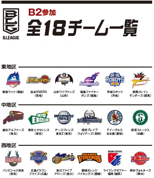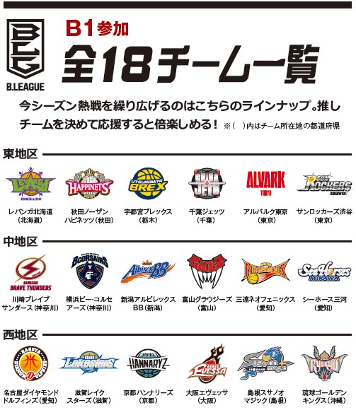 B1とその下位リーグのB2からなり、それぞれ18チームが東・中・西の3地区に分かれ、地域密着のホームタウン制を敷いています。