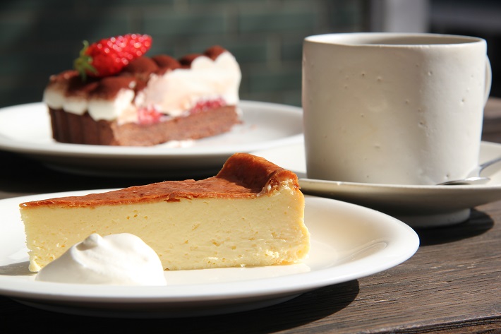 写真はチーズケーキと季節のケーキ(イチゴとショコラのタルト)。