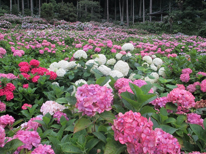 広大な敷地と豊かな自然環境に恵まれた園内では、鮮やかに咲き誇る色とりどりのアジサイを一望のもとに観賞できます。