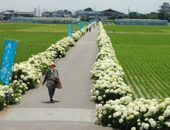 東武伊勢崎線加須駅南口より朝日バス「騎西城」降車すぐ ※ふじとあじさいの道は、騎西文化・学習センター(加須市根古屋633-10)から玉敷公園(加須市騎西535-1)まで