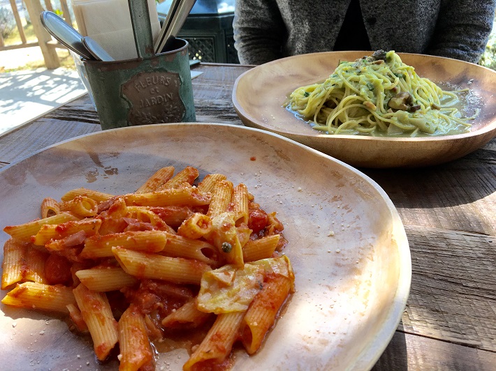 この日のおすすめパスタは「モンタデッラとキャベツのトマトソースペンネ」(手前)「パンチェッタのパスタ~カボチャと椎茸~」(奥)の2種。