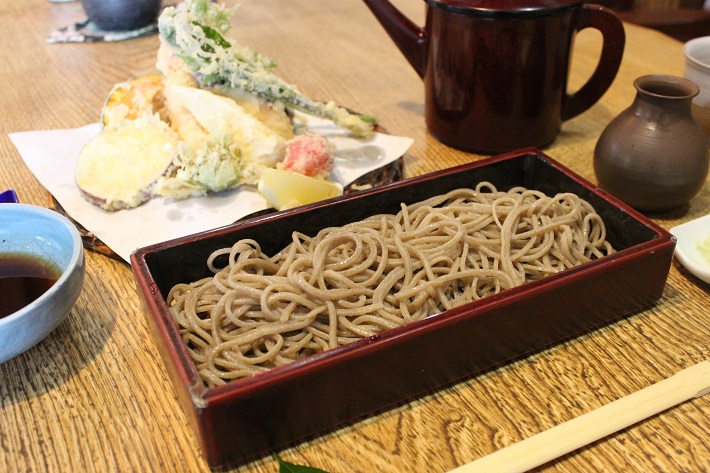 天ぷらは山菜を中心に、季節の野菜とお魚、自家製蕎麦粉入り胡麻豆腐という組み合わせ。