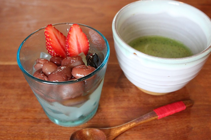 デザートは手作り寒天に金時豆といちごが乗ったもの。
