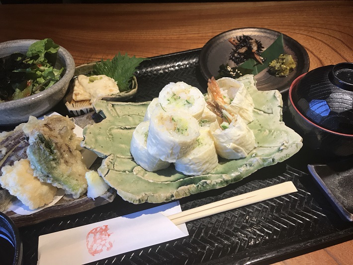 ゆば巻きずしに京都から取り寄せているという汲み上げゆば、ゆばの天ぷら、さらにサラダと小鉢3点盛り、デザートまで付いて、ヘルシーなのに十分な満足感。