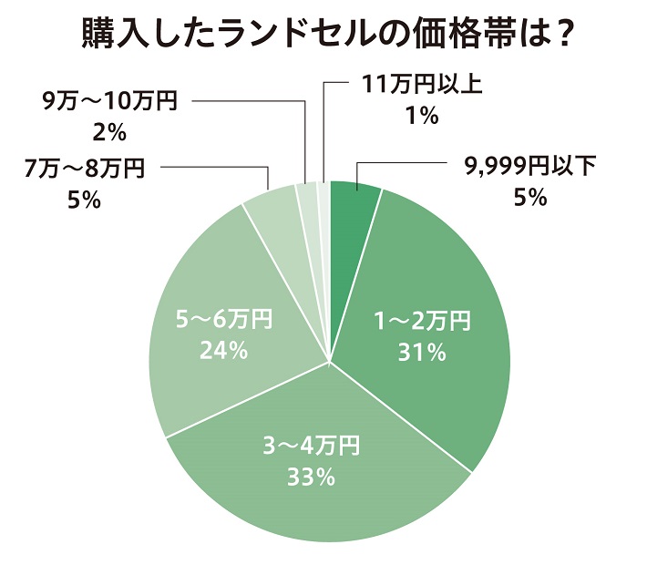 価格の幅が広いランドセルですが、アンケートの結果を見ると「3~4万円」(33%)、「1万円~2万円」(31%)、「5~6万円」(24%)あたりがボリュームゾーン。