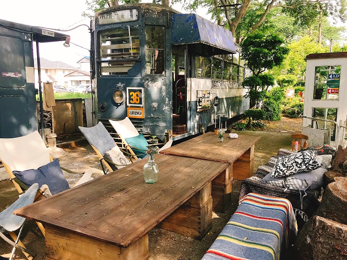 工房は緑に囲まれ、階段を昇ると、かつてカフェとして利用されていた古い都電が残る広場があります。