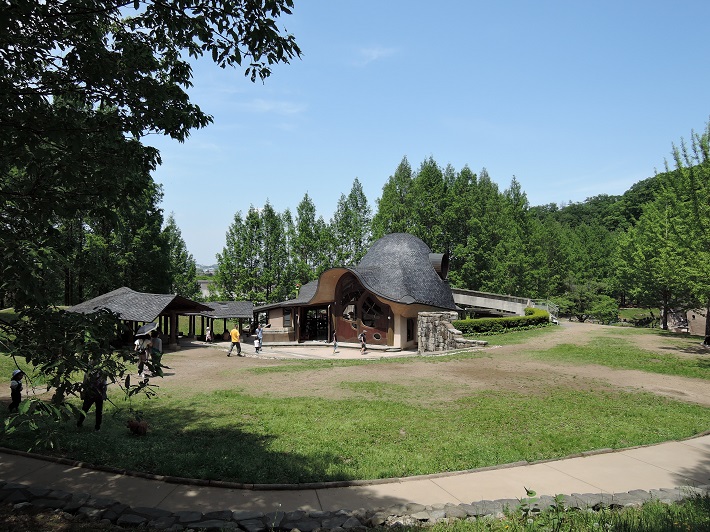 「加治丘陵」に位置する傾斜のある地形で、高台から流れる小川のほとりにSNSなどでよく目にするランドマーク的存在の「きのこの家」や青い水浴び小屋、多目的ホールがある「子ども劇場」、ムーミンに関する書籍等が置いてある「森の家」と北欧風の建物が点在しています。