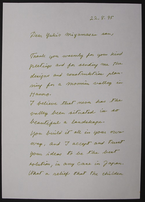 とてもすばらしい風景のもとに、ムーミン谷ができあがるものと確信いたします。(中略)子どもたちがこのムーミン谷で入場料などを払わずに、自由に遊んだり、泳いだり、山登りをしたり、安らいだりできるということに心から安心いたしました!