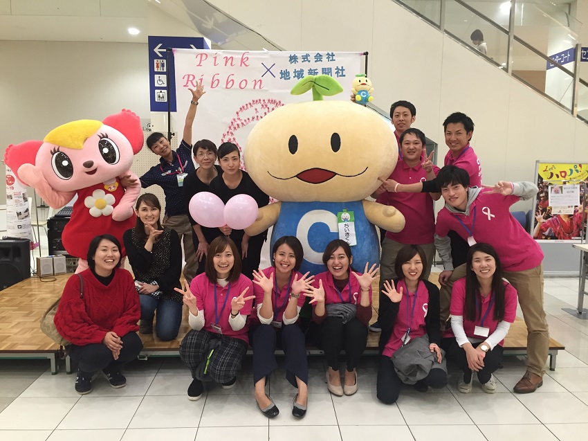 ㈱地域新聞社では、乳がんの正しい知識を広め、多くの女性に検診を受けてもらい、乳がんの早期発見を推進する目的で、2010年よりピンクリボン運動を行っています。 「ちいき新聞」(千葉県・埼玉県で発行しているフリーペーパー)紙面での「ピンクリボン運動応援号」に加え、2012年よりショッピングモールなどの施設に検診カーを用意し、ママがお買い物ついでに気軽に乳がん検診が受けられるようにとイベントを続けています。