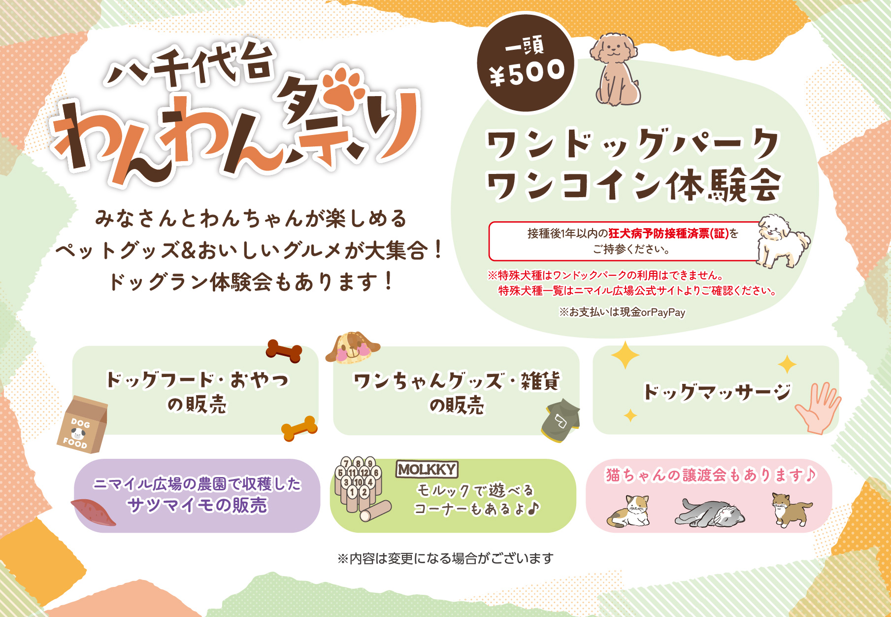 入場料無料。ドッグラン体験会500円/頭。その他イベント内の飲食・物販は有料。