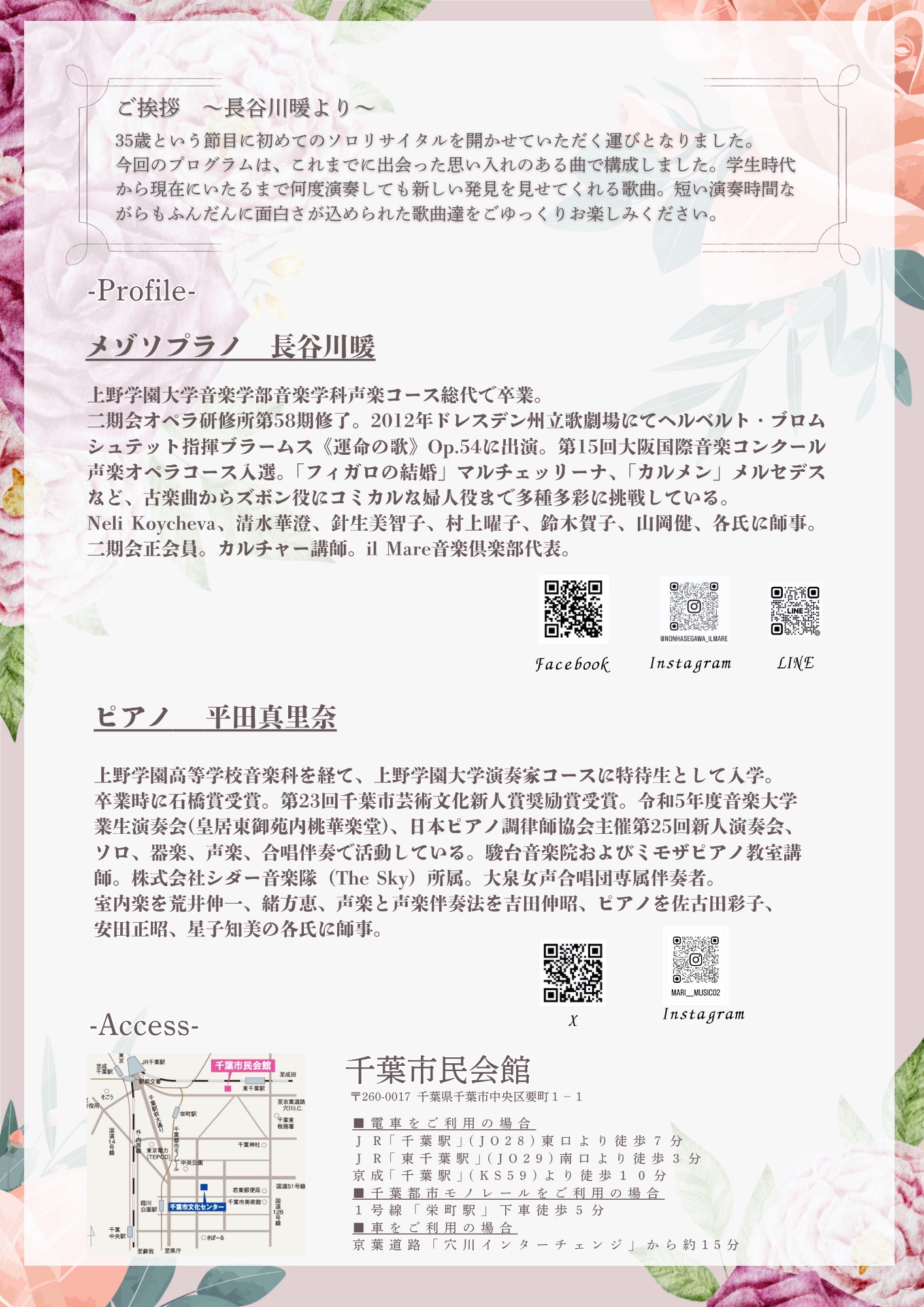 心に残る歌を分かちあい、暖かな気持ちで一年を結びます。 出演:長谷川暖 平田真里奈 ○山田耕筰 この道 〇トスティ バラ 〇ベッリーニ 優雅な月よ 〇リスト 愛の夢/ラ・カンパネラ ほか