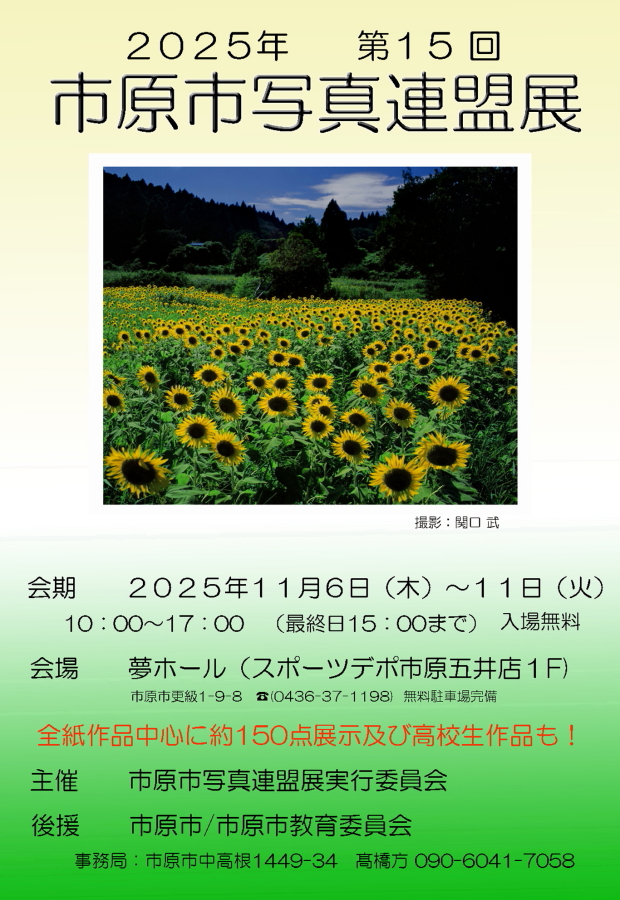 市原市写真連盟展が開催されます。会員、協力団体、一般写真愛好家の応募で、93人が、全紙サイズの作品166点を発表します。 様々なジャンルの作品を鑑賞することができますので、どうぞおいで下さい。