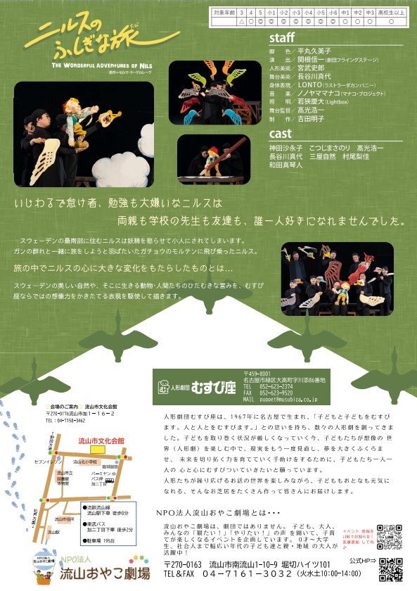 名古屋の人形劇団むすび座の新作! 首都圏初公演です。 ニルスは、妖精を怒らせて小人にされてしまいます。ガチョウのモルテンに乗ってスウェーデンを旅する中で、仲間との絆を育み成長していきます。