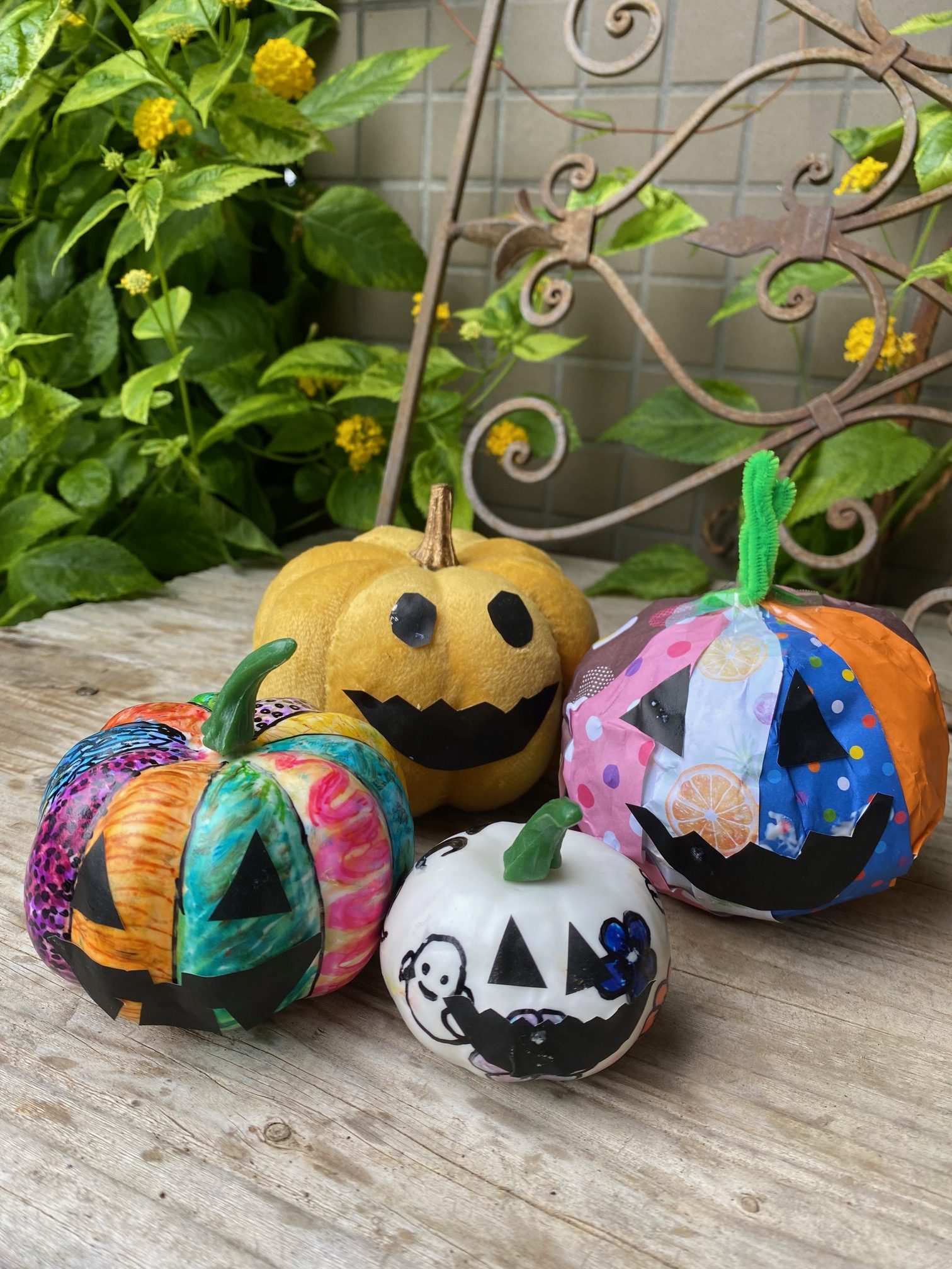 白いかぼちゃ(フェイク)にマジック、絵の具、折紙を使って思い思いの自分だけのハロウィンかぼちゃを作ります。 また新聞紙を丸めて紙を貼ったり絵の具でペイントして最後に折紙で切った目と鼻を付けたら完成です。