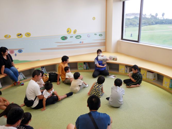 親子ライブラリで絵本の読み聞かせを行います。民話をもとにした海の生きものたちのお話を聞いたあとは、生きものを観察してみよう!