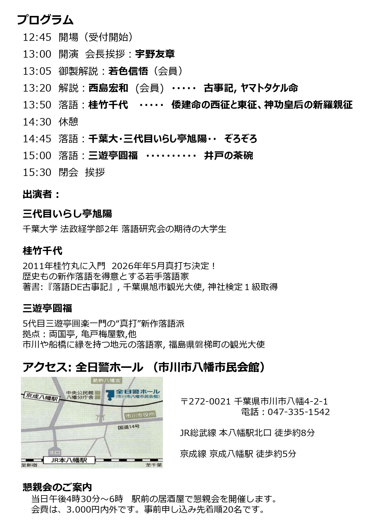 落語を通じて、古事記を身近に感じ楽しんで頂きます。今回は、日本人の心情がにじみ出る「倭建命」の場面です。