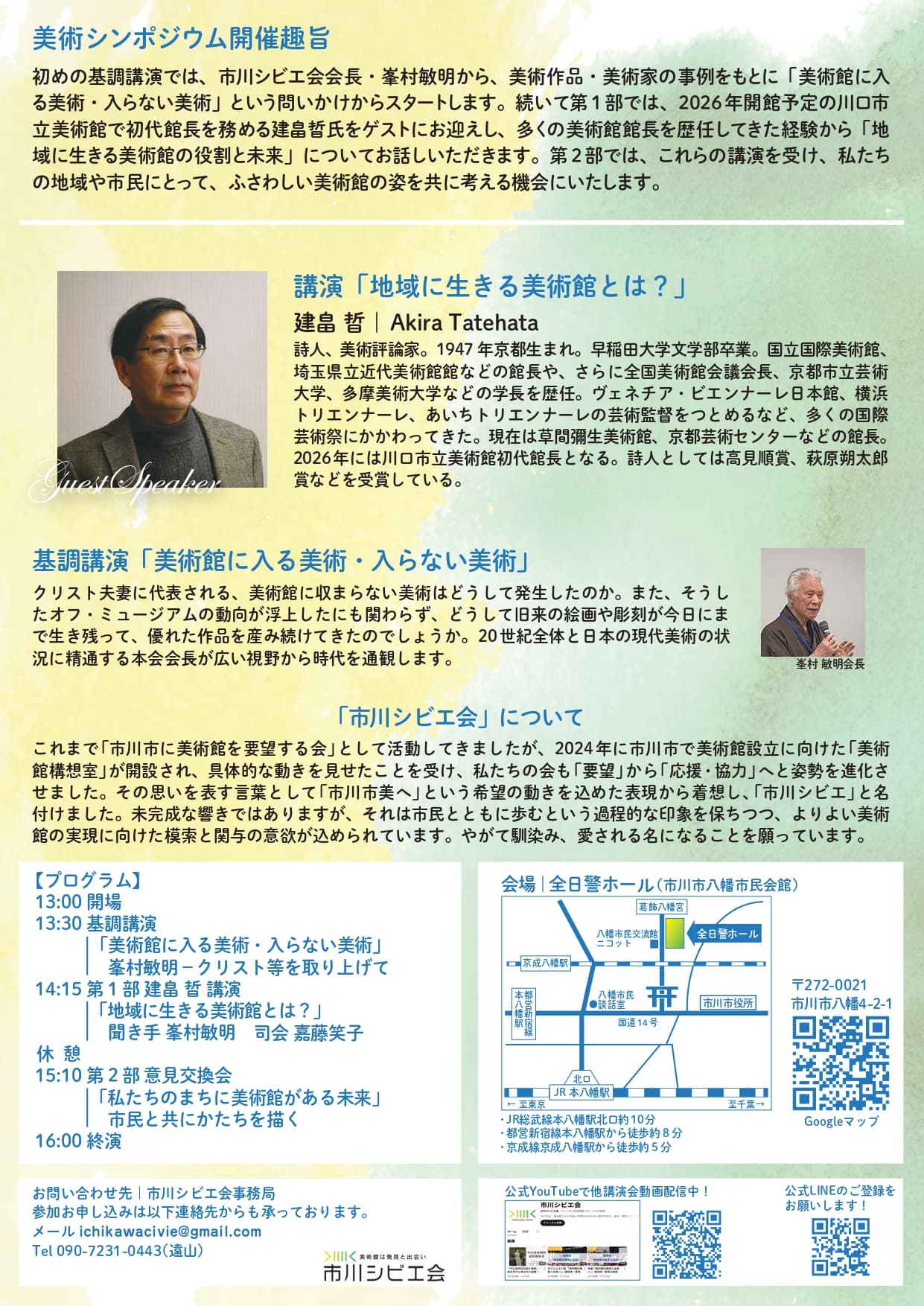 市民と考える美術シンポジウム。 峯村敏明会長基調講演「美術館に入る美術・入らない美 術」、第1部:建畠 晢 講演会「地域に生きる美術館とは?」、第2部:市民との意見交換会「私たちのまちに美術館がある未来」。 美術館は、どんな作品を残し、どんな展示を行い、未来へと何を伝えていく場所なのか。 地域にとっての「美術館はどんな存在であるべきか」を、みなさんと一緒に語り合う