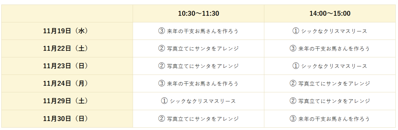 ①シックなクリスマスリース 4,000円、②写真立てにサンタをアレンジ 2,000円、③ 来年の干支お馬さんを作ろう2,500円+入園料:幼児(4歳以上)100円、小・中学生200円、高校生(生徒証提示)600円、一般900円