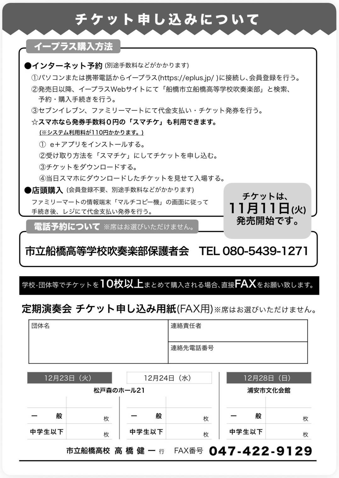 12/23(火)12/24(水) 「松戸森のホール21」開場17:00開演17:30 12/28(日) 「浦安市文化会館」開場16:00開演16:30 「船橋市立船橋高等学校吹奏楽部 第42回定期演奏会」のお知らせです。 チケットは11/11(火)より発売開始です。