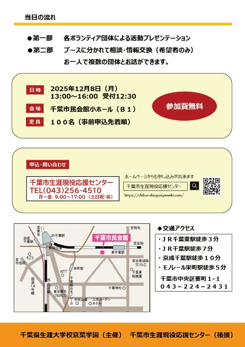 - 備考:詳しくは、ホームページ「千葉市生涯現役応援センター セミナー」で検索してください
