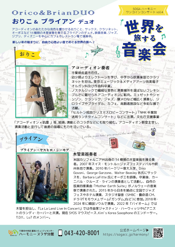 アコーディオンのあたたかな音色を響かせるおりこと、サックス、クラリネット、オーボエなど14種類の木管楽器を奏でるブライア ンのデュオ。新しい年の始まりに、自由で心地よい音でめぐる世界の旅へ出かけませんか?