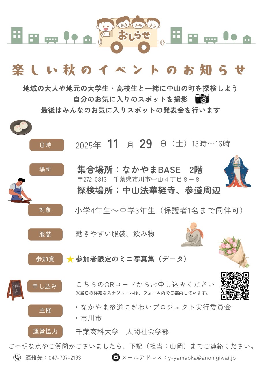 中山法華経寺参道および周辺を舞台に、小学生・中学生を主役に、地域の高校写真部・大学生が協働し、参道内の地域の方々と関わりながら、散策・撮影するイベントです!ぜひ参加してみませんか?