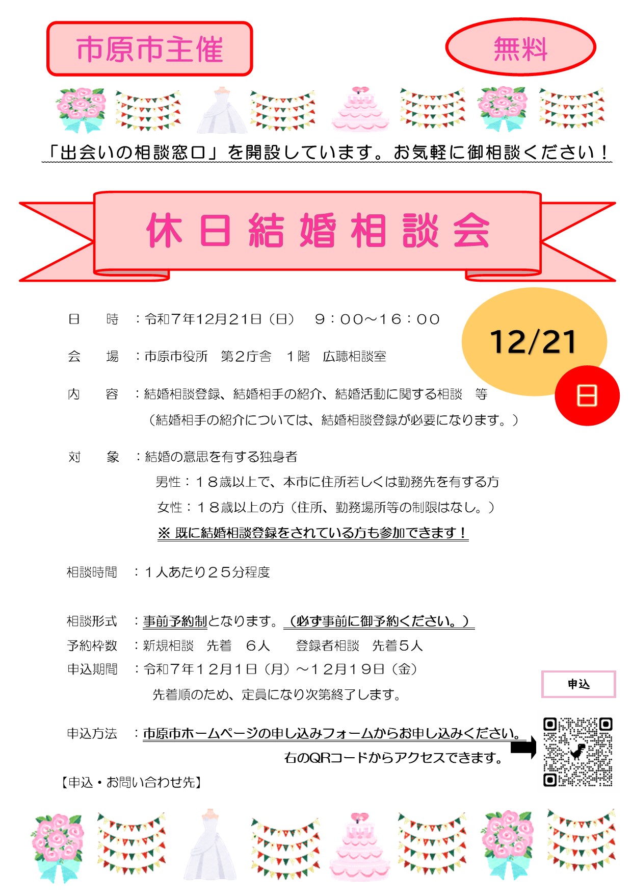 市原市では、結婚を希望する独身の方を対象として、「休日結婚相談会」を開催いたします。結婚相談員から、相談者の状況に応じたアドバイスを無料で受けることができます。お気軽にご参加ください。
