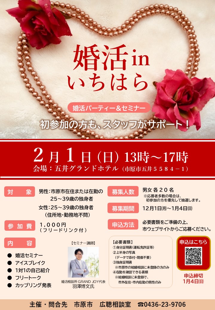2月1日(日)に「婚活inいちはら」(パーティー)を開催します。当日は、婚活セミナーや1対1の自己紹介、フリートークを行います。ぜひご参加ください。