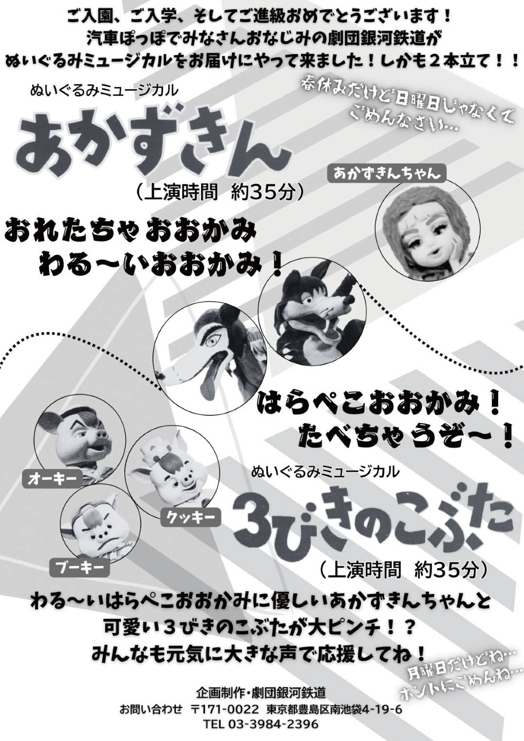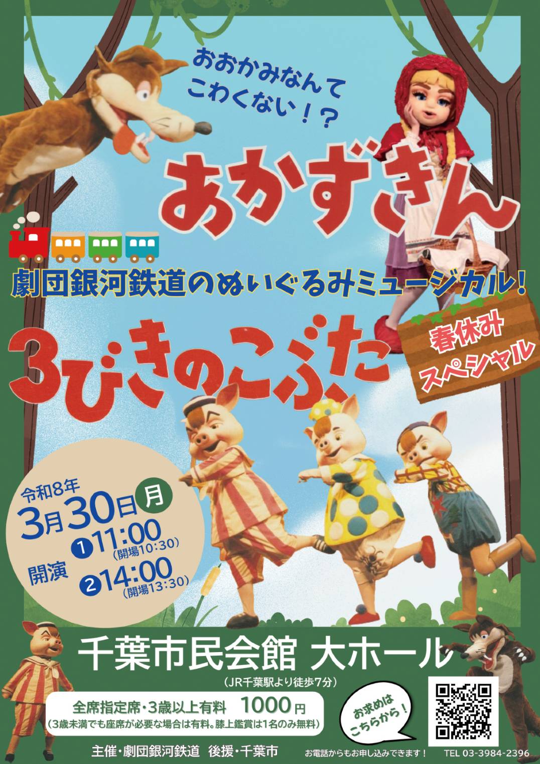 銀河鉄道が千葉市民会館にやってきます。劇団銀河鉄道の春休み公演は「あかずきん・3びきのこぶた」の豪華2本立てです。シンプルで分かりやすいお話は初めての観劇にもピッタリです。皆でおおかみをやっつけよう。