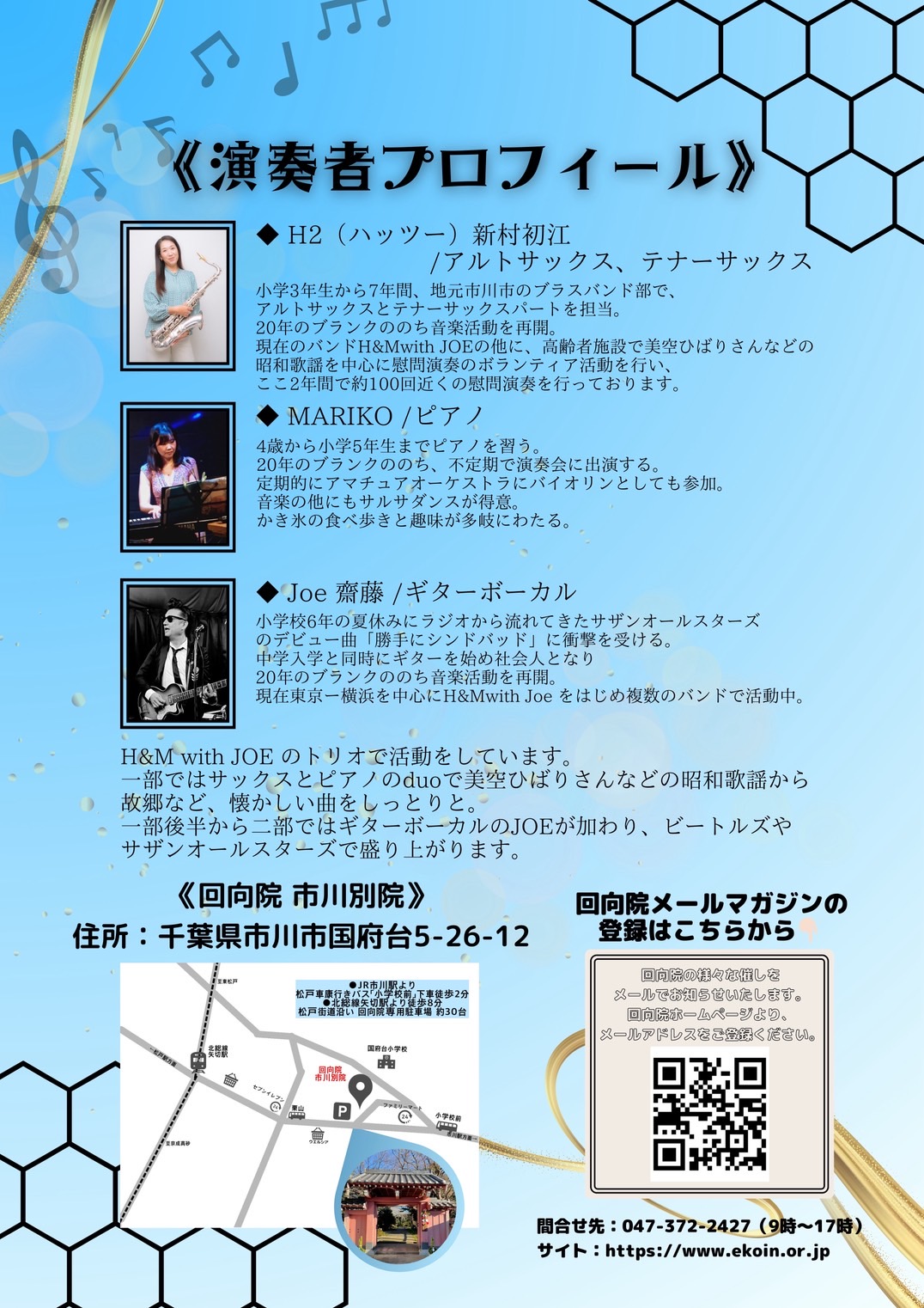 平成26年4月より始まった「回向院楽しきかなコンサート」の続編。 今回はサックスとピアノとギターボーカル。 馴染み深いあの曲も。。。 元気な歌声と共に、心晴れやかにお寺でのコンサートをお楽しみください。