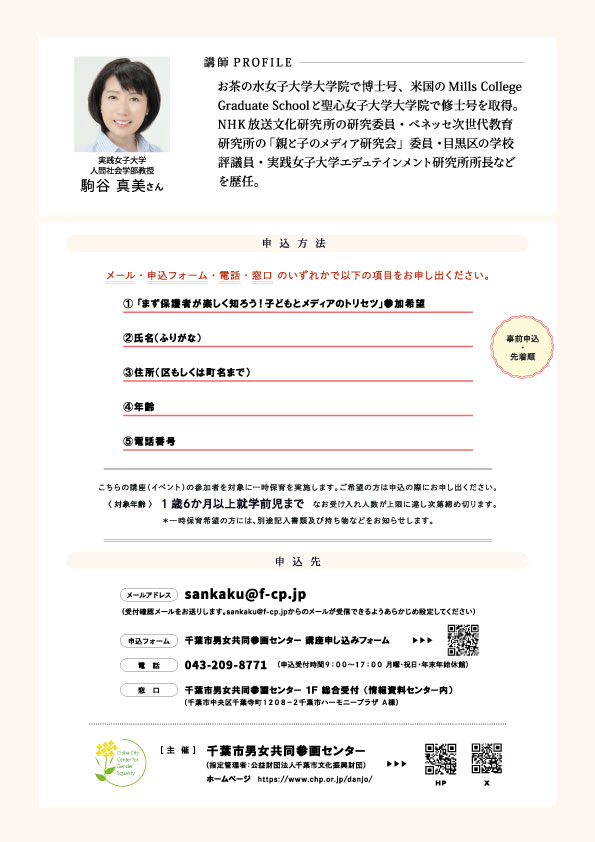 - 千葉市男女共同参画センターに、メール(sankaku@f-cp.jp)・申込フォーム・電話(043-209-8771)・窓口よりお申し込みください。