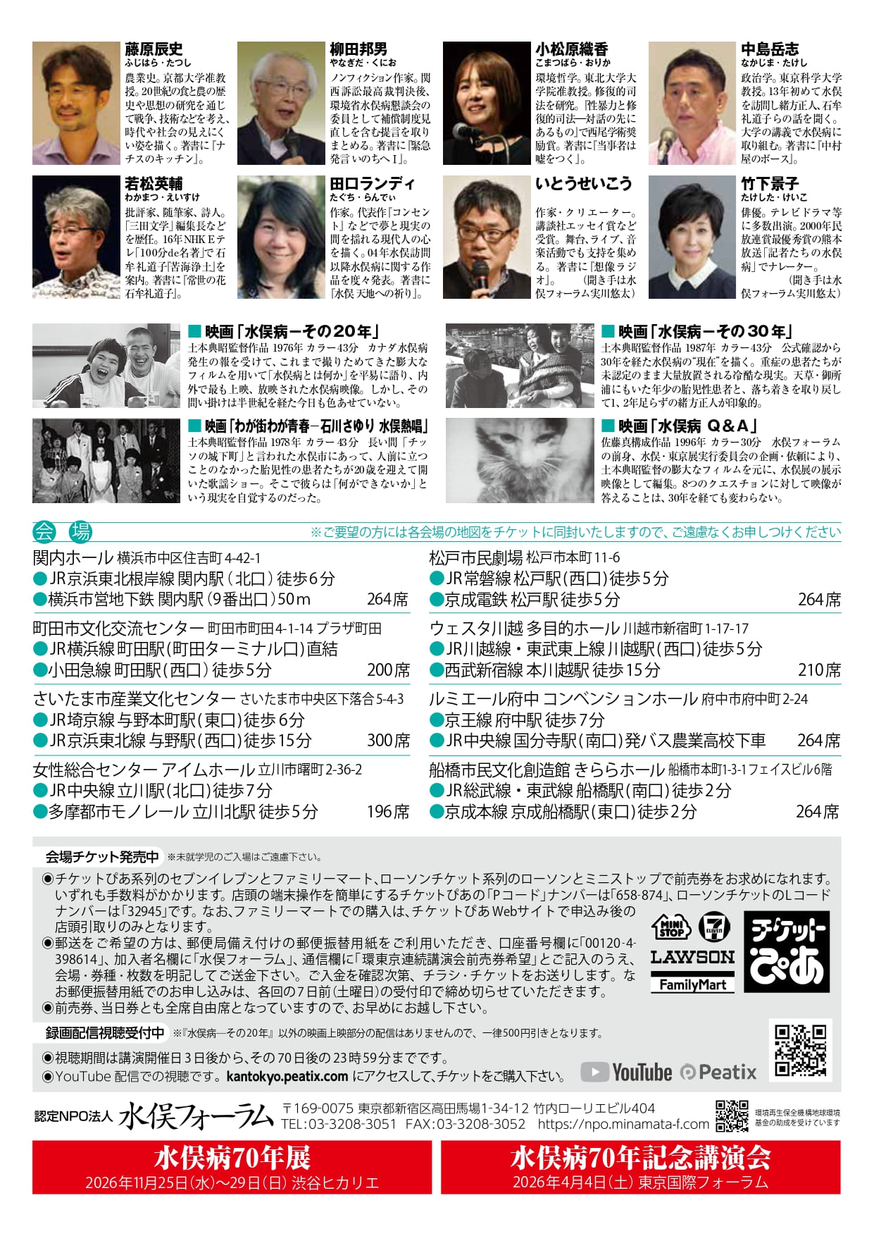 - チケット販売 ● [来場用チケット] チケットぴあ・ローソンチケット・水俣フォーラム ●[配信用チケット] Peatixで受付。申込→https://kantokyo.peatix.com/