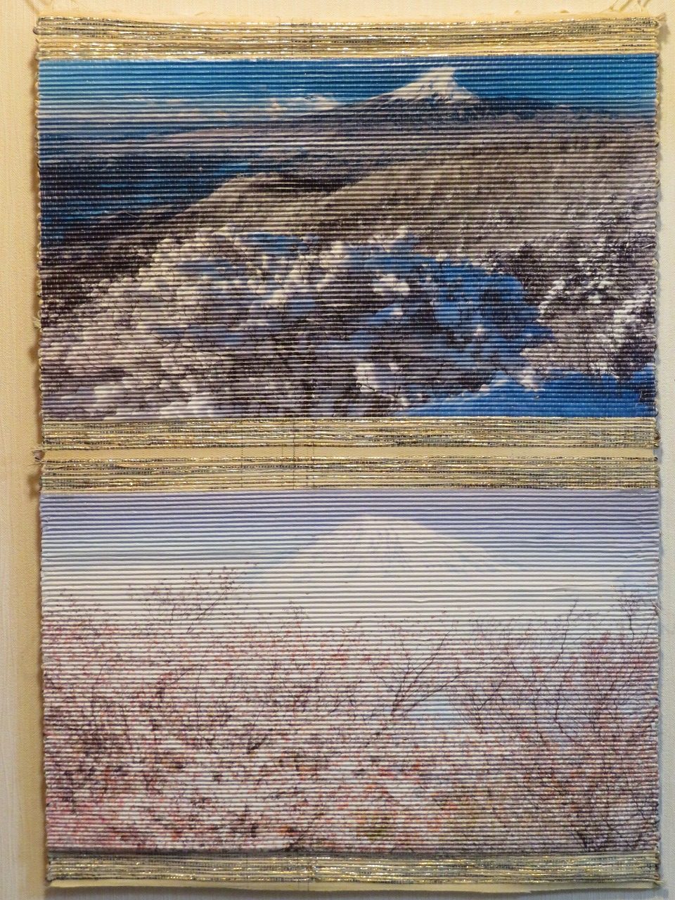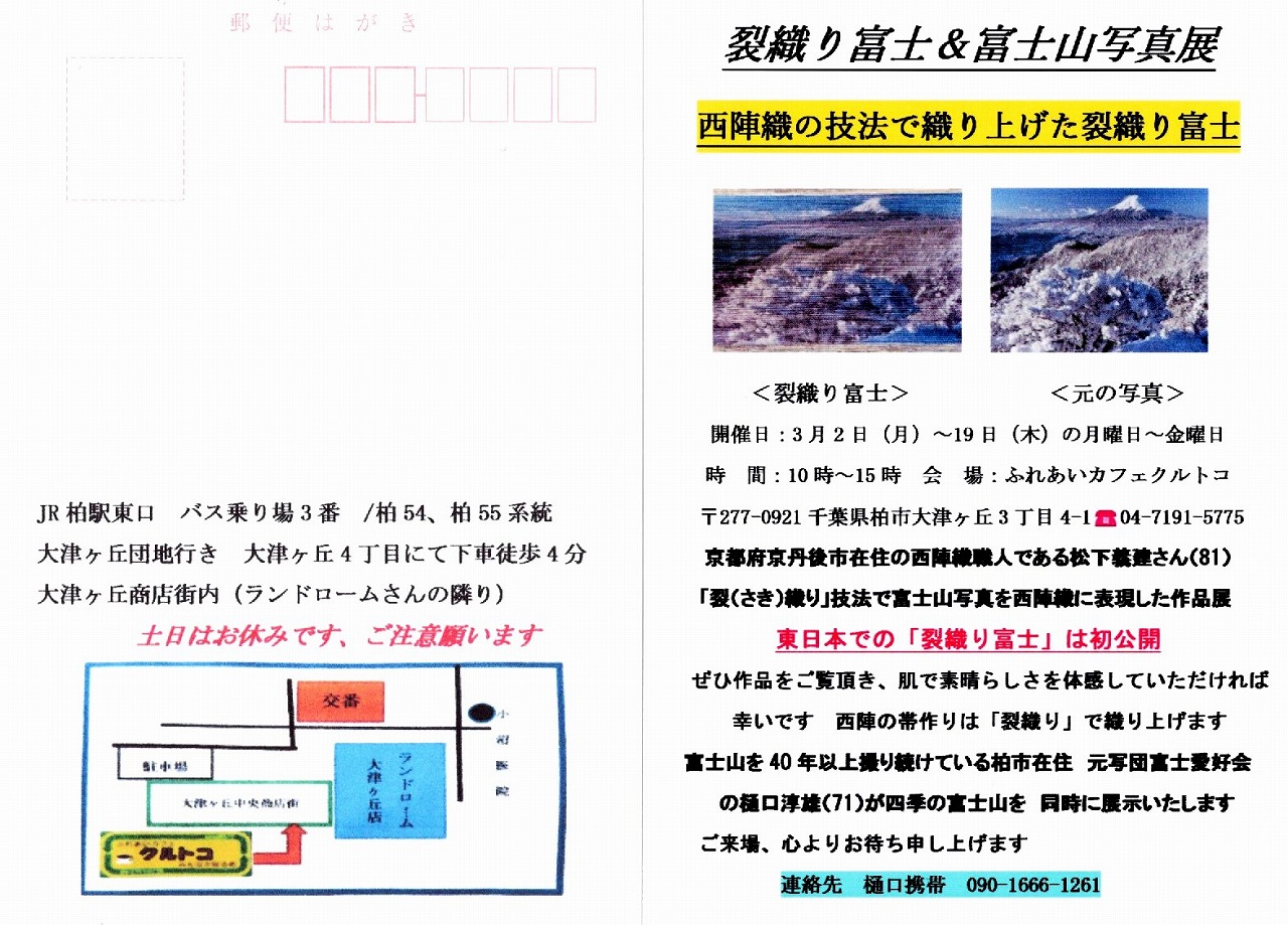 西陣織の技法で織り上げた裂(さき)織り富士と四季の富士山写真を展示します。 京都府京丹後市在住の西陣織職人 松下義建(ぎけん)さん(81)と柏市在住の元富士愛好会で42年富士山を撮り続ける樋口淳雄(71)が出会い実現した展示会です。東日本での「裂織り富士」は初公開です。