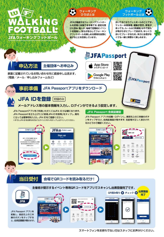 「走らない、歩くサッカー」 ~みんなでウオーキングフットボールを楽しもう~ 持ち物:上履き、水分補給用飲み物 運動のしやすい服装でお越しください 対象:小学生以上(小学生は保護者同伴)障害の有無、年齢、性別にかかわらず、スポーツに興味のある方 「ウォーキングひろばin船橋アリーナ」終了後は、同時開催中のユニバーサルスポーツ教室にも参加可能です
