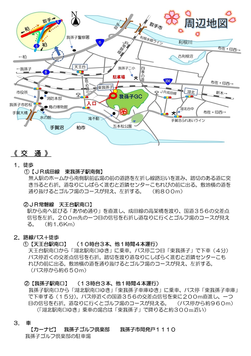 アクセス:・JR成田線東我孫子駅南側出口より徒歩10分 ・JR常磐線我孫子南口から板東バス「東我孫子車庫行き」終点下車(所要12分)徒歩10分 ・JR常磐線天王台駅南口から板東バス「湖北駅南口行き」乗車二つ目「東我孫子」下車徒歩10分