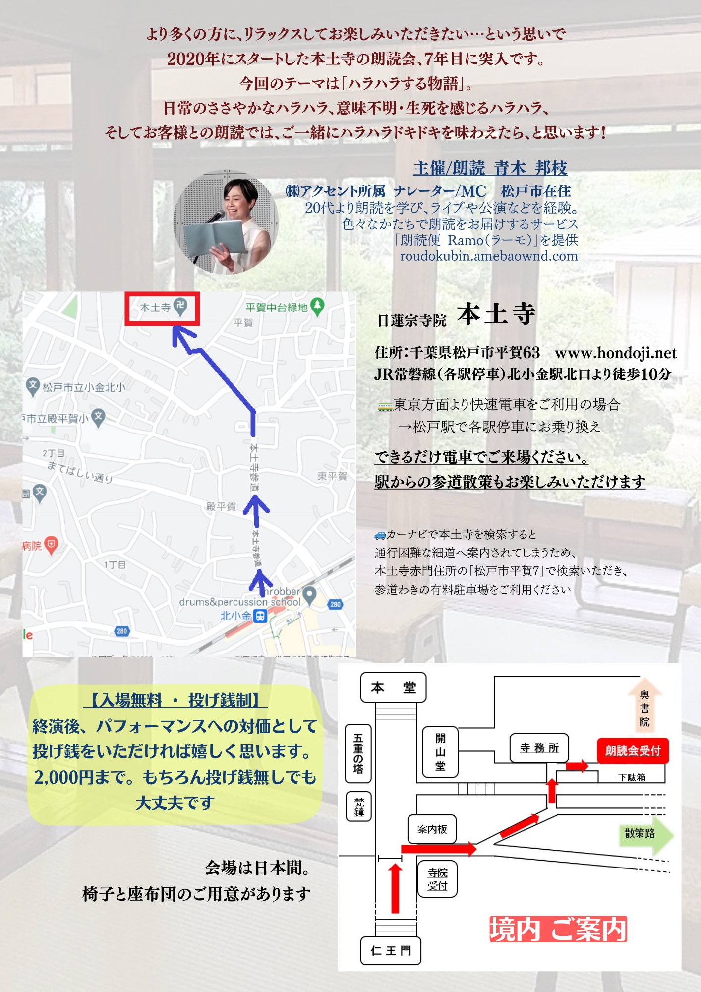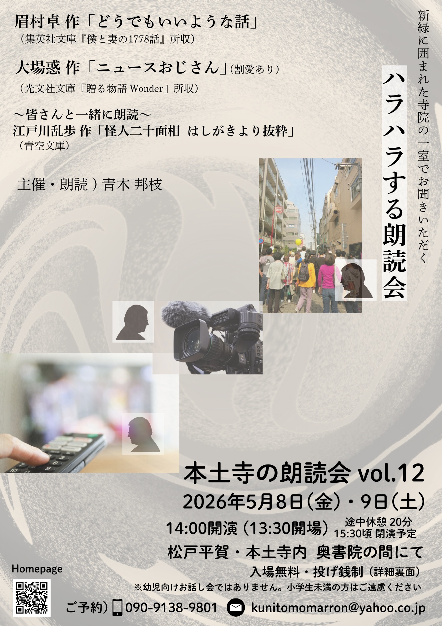 新緑のお寺の一室で、ハラハラする物語の朗読をお楽しみください