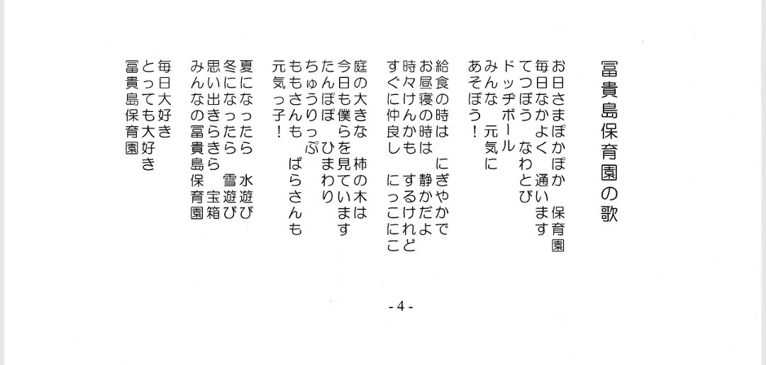 冨貴島保育園の年長児が、卒園記念作品として「園歌」を作りました。 令和12年に閉園が決まっている冨貴島保育園。 卒園児が小学校高学年くらいになった頃にふとこの場所を通った時にはもう跡形も無くなっているかもしれないけれど、 ここに確かに保育園があって、通っていたんだよ、ということを忘れないように、 思い出をたくさん歌詞に込めました。 そして卒園式で皆で歌い、大好きな保育園にプレゼントしました。 もう卒園式も終わり、春休みモードの年長組ですが、 毎日のように自分たちで作った「保育園の歌」を歌っているようです。 5年後には幻の園歌となる運命ですが、少しでも園児の記憶に残ってくれたらいいなと思っています。