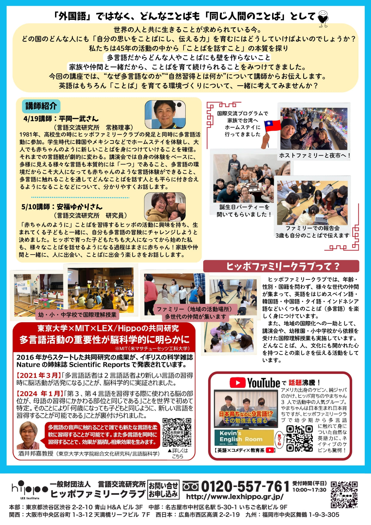 世界の人と共に生きることが求められている今。 どの国のどんな人にも「自分の思いをことばにし、伝える力」を育むにはどうしていけばよいのでしょうか? 私たちは45年の活動の中から「ことばを話すこと」の本質を探り 多言語だからどんな人やことばにも壁を作らないこと 家族や仲間と一緒だから、ことばを育て続けられることをみつけてきました。 今回の講座では、“なぜ多言語なのか”“自然習得とは何か”について講師からお伝えします。 英語はもちろん「ことば」を育てる環境づくりについて、一緒に考えてみませんか?